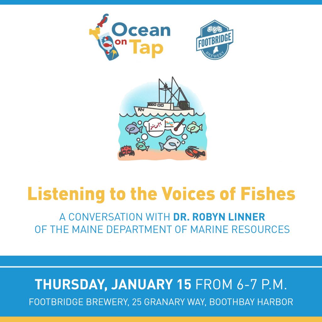 Next Thursday, please join us at Footbridge Brewery for the next talk in the Ocean on Tap series. Dr. Robyn Linner of the Maine Department of Marine Resources will present Listening to the Voices of Fishes, sharing how scientific surveys can help fish teach us about our changing oceans. We hope to see you at this fun conversation!