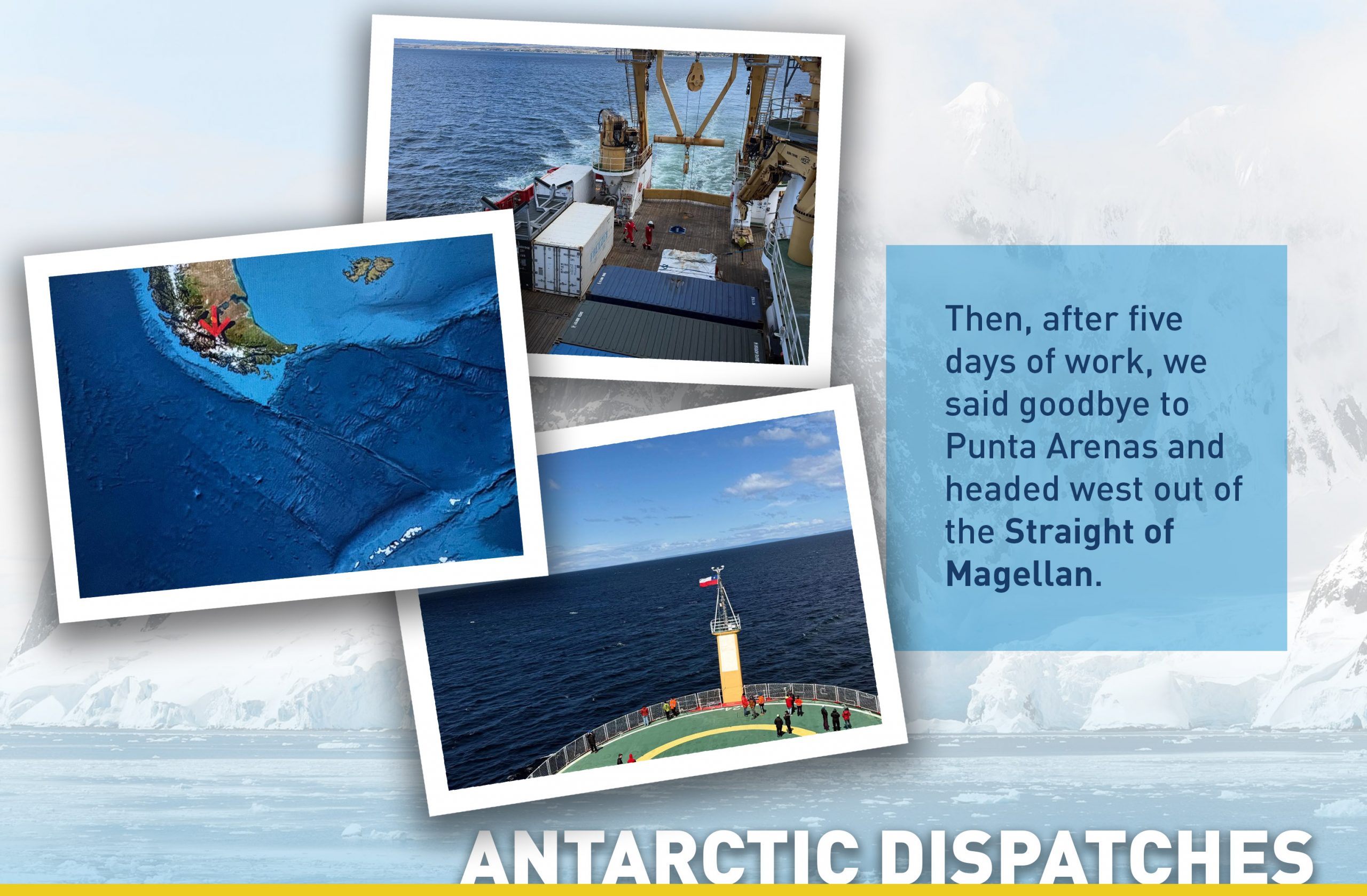 After five days of work, we said goodbye to Punta Arenas. Many folks waved from the helicopter, or helo, deck. Then, we headed west out of the Straight of Magellan.
