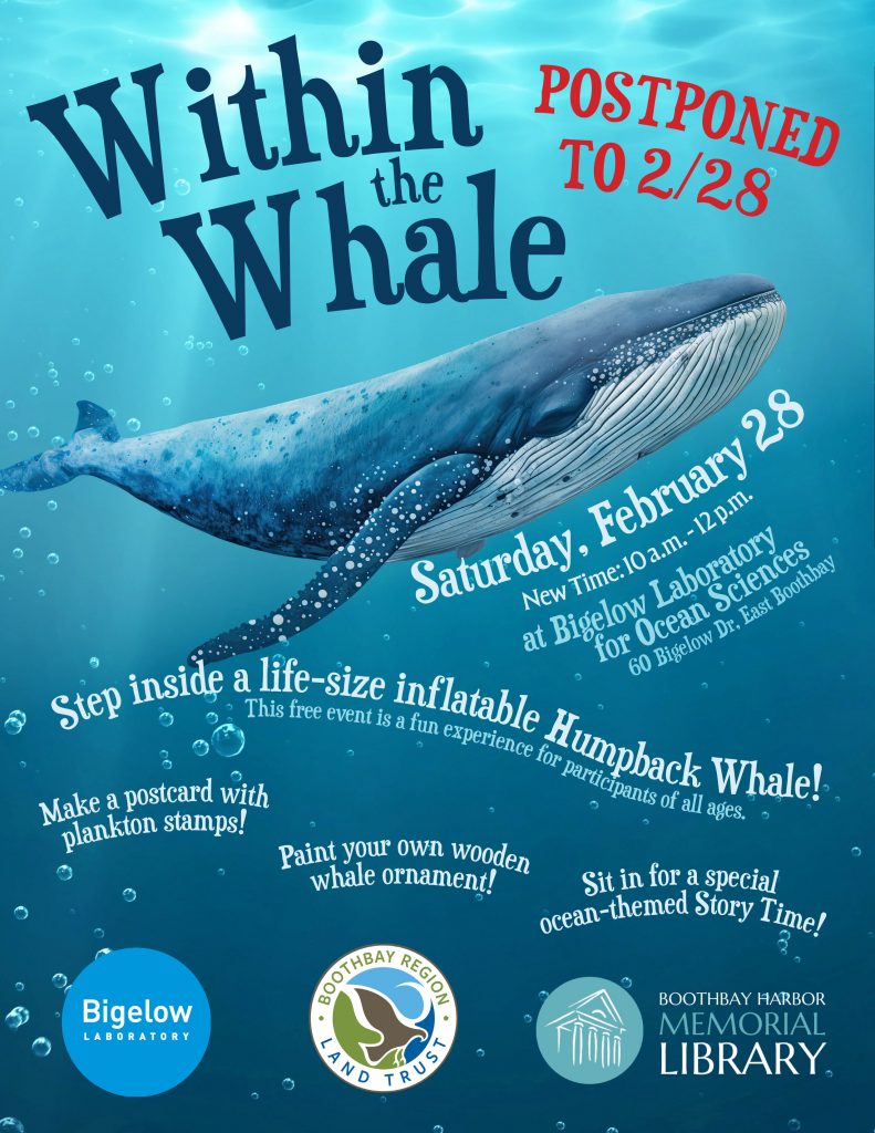 Join Bigelow Laboratory, Boothbay Harbor Memorial Library, and Boothbay Region Land Trust for Within the Whale! 🐋 Take an immersive educational journey by stepping inside an inflatable humpback whale, and enjoy other fun ocean-themed activities at Bigelow Laboratory’s campus in East Boothbay. Free and open to participants of all ages!