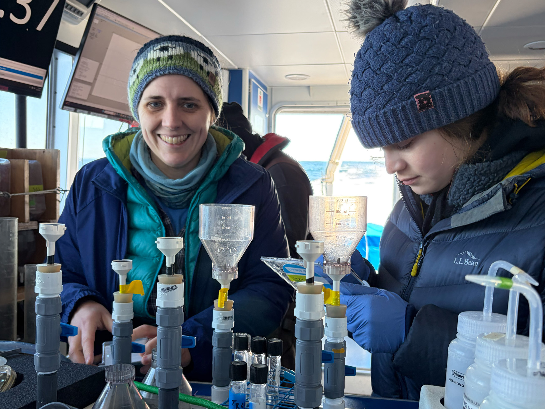 “Five minutes,” Dave calls from the wheelhouse. Those of us in the lab space on board look at each other, not sure if we can wrap up processing from the last sampling station before the next one arrives. We were supposed to be fair weather scientists. We prefer light winds and calm seas to reduce interference and to travel at speed. But here we are in February, heaving off of Monhegan Island, ice building up on the rails, and the deck a slushy mess. We are bouncing around, spilling water, and struggling to keep the filters from flying off their stands. But the skies are clear, not a cloud in sight. That’s why we picked today.
