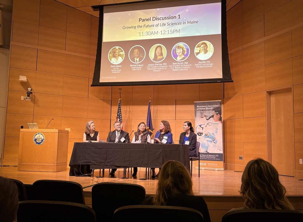 On October 8, Vice President for Research Beth Orcutt (pictured, second from right) spoke during the Growing the Future of Life Sciences panel at the Bioscience Association of Maine (BioME) annual conference held at the University of Southern Maine. Moderator Sarah Delmar, director of the recently established Maine Life Science Center, called attention to Bigelow Laboratory for successfully planting a flag in Maine to showcase our state’s blue biotech capabilities and talent.